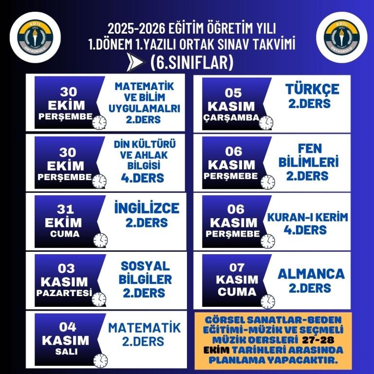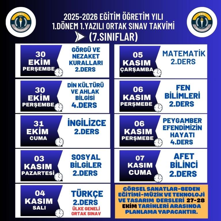 2025-2026 eğitim öğretim yılı 1. Dönem 1. Yazılı Sınavları, MEB sınav takvimine uygun olarak [30 Ekim-7 Kasım] tarihleri arasında gerçekleştirilecektir.